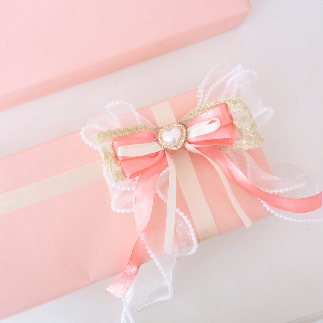 一つひとつ丁寧に仕上げたハンドメイドリボン。淡いピンク×ゴールドの限定カラー。