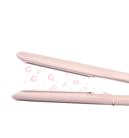 ヒートプレートの下部に搭載された噴射⼝からマイナスイオンが噴射され、髪全体に⽔分を⾏き渡らせます。