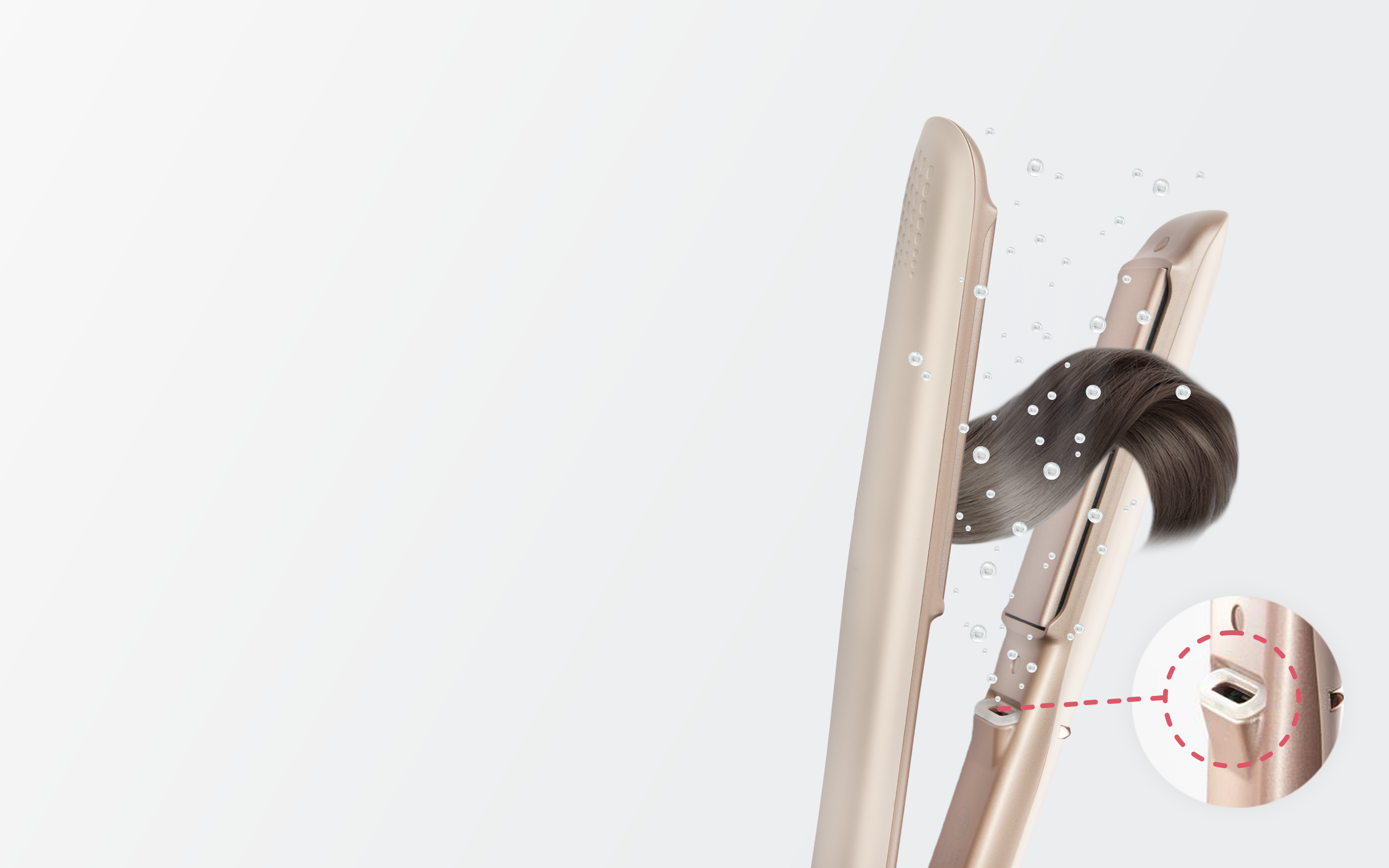 パレル両サイドの下部に搭載された噴射⼝からマイナスイオンが噴射され、髪全体に⽔分を⾏き渡らせます。